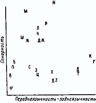 (Ч, Ш, Ж, ДЖ, Ц, С, 3, ДЗ) и остальные. 2-я ось разделяет сибилянты по частоте: высокочастотные — свистящие (3, С, Ц, ДЗ) и низкочастотные — шипящие (Ч, Ш, Ж, ДЖ). 3-я ось (рис. 3) выделяет из всех согласных группу сонорных (М, Н, Л, Р); 4-я соответствует месту образования звуков: от губных к заднеязычным. Первый уровень составляют губные звуки (П, Б, В, Ф, Т), второй — зубные (Ц, Ч, С, Л, 3, Ж, ДЖ, Н, ДЗ), третий — переднеязычные (Т, Д) и четвертый — заднеязычные (К, Г). 5-я ось выделяет дрожащий звук Р. Интересной является 6-я ось, она соответствует признаку «глухость — звонкость», но «количество звонкости» определяется как бы в относительной степени; противопоставление «глухости — звонкости» реализуется на всех согласных, но попарно: С лежит дальше от начала координат, чем 3; Ш — дальше, чем Ж; Ч — дальше, чем ДЖ, и т. д. То же самое справедливо для пар Т—Д, П—Б, К—Г, Ф—В.