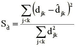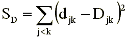Известны три подхода к шкалированию: линейный, нелинейный и неметрический. Линейный подход, предложенный Торгерсоном [9], основан на ортогональном проектировании в подпространство, образованное направлениями, характеризующимися значительным разбросом точек. Такое решение дает maxеd2jk при ортогональном проектировании.В нелинейном случае [1, 7, 11] пытаются найти отображение D ® d, которое бы минимально искажало исходные различия Djk. Вводится критерий качества отображения, называемый «стрессом» и измеряющий степень расхождения между исходными различиями Djk и результирующими расстояниями djk. С помощью аппарата нелинейной оптимизации ищется конфигурация точек, которая давала бы минимальное значение «стрессу». Значения координат этих точек и являются решением задачи. В качестве «стресса» используются разные виды функционалов, в простейшем случае