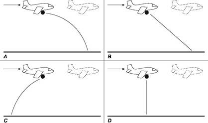 2. Шар упадет вперед по кривой, и в тот момент, когда он коснется земли, самолет будет пролетать как раз над ним. Интуитивно нарисовали дугу, похожую на действительную траекторию шара (А), 40% опрошенных студентов Университета Джона Хопкинса, принимавших участие в исследовании Макклоски. Вопреки идее Аристотеля о том, что тяжелые предметы падают быстрее, шарикоподшипник и мяч от боулинга упадут на землю одновременно. Хотя идея Аристотеля была неверна, интуитивно она казалась достаточно правдоподобной для того, чтобы продержаться несколько веков.