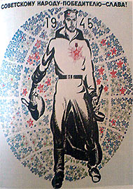 Во втором способе согласования в качестве меры-камертона выступит уже не желто-оранжевый, а противоположный ему синий цвет. Здесь также необходимо соблюсти тонкую настройку тонов. Отметим, что в обоих случаях среднего цвета-меры может не быть в композиции, а он явится третьим цветом, образуя гармоничную триаду цветовых тонов. Приведем пример, в котором цвет, противоположный цвету-мере, является третьим цветом композиции. Так, в плакате «Советскому народу-победителю — слава!» (рис. 134) советский солдат изображен на фоне карты земли, освобожденной от фашизма. Карта как бы соткана из живых цветов. В композиции цветов использованы три цветовых тона: красный, зеленый, синий, то есть те цвета, которые рассмотрены как гармоничная триада. Вспомним также, что это основные, первичные цвета слагательного смешения тонов.
