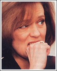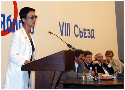 Теперь Ирина Хакамада. Вернитесь еще раз к выступлениям Явлинского и Немцова, а теперь посмотрите на руки слушателей Хакамады: они, как по команде, взметнулись к лицу. Даже Лукин изменил позу и развернулся, образуя на пару с Явлинским жестовое единодушие к Хакамаде (видимо, по этому вопросу их позиция не отличается).