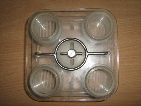 Устройство для экспресс-диагностики лактационного мастита выполнено в виде миниатюрных кювет с перфорированными днищами, имеющих возможность перемещения в вертикальной плоскости и состыковки с приемными ячейками. Перед кормлением ребенка мать сцеживает минипробы грудного молока в кюветы и добавляет к ним несколько капель индикатора — поверхностно-активного вещества (раствора стирального порошка). После подъема кювет над приемными ячейками молоко процеживается сквозь перфорированные днища кювет. При этом неинфицированное молоко характеризуется однородной консистенцией и свободно протекает в приемные ячейки сквозь перфорированные днища кювет. В инфицированном же (маститном) молоке поверхностно-активное вещество, взаимодействуя с соматическими клетками, образует конгломераты, слизь и сгустки, которые остаются на поверхности перфорированного днища кювет и легко визуально обнаруживаются. Таким образом, одним движением (подъемом кювет) одновременно диагностируется пробы молока с каждой молочной железы.