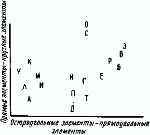 Что касается факторов, то один из них оказалось возможным интерпретировать как наличие только прямых элементов—наличие только круглых элементов; в середине расположились буквы, состоящие из прямых и круглых элементов одновременно. Второй фактор интерпретируется как наличие остроугольных элементов — наличие прямоугольных элементов.
